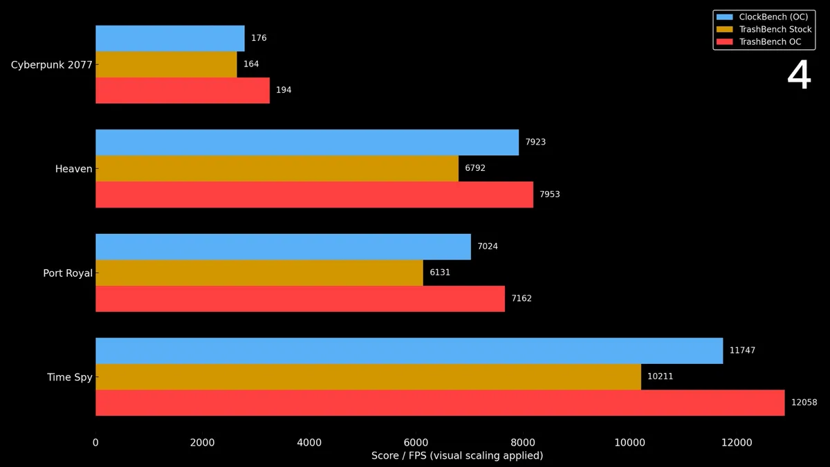 Güç limiti kalkan ve sadece voltaj ile termal limitlerle sınırlanan kart, bu sayede %23’lük etkileyici bir hıza ulaştı. Modern GPU’larda, shunt moduyla bile %10’luk bir hız aşırtma başarısının zor elde edildiği düşünüldüğünde, %23’lük artış önemli bir başarı olarak öne çıkıyor. Trashbench, yaklaşık iki hafta önce de Intel Arc B580 modeliyle bir hız aşırtma rekoru kırmıştı.